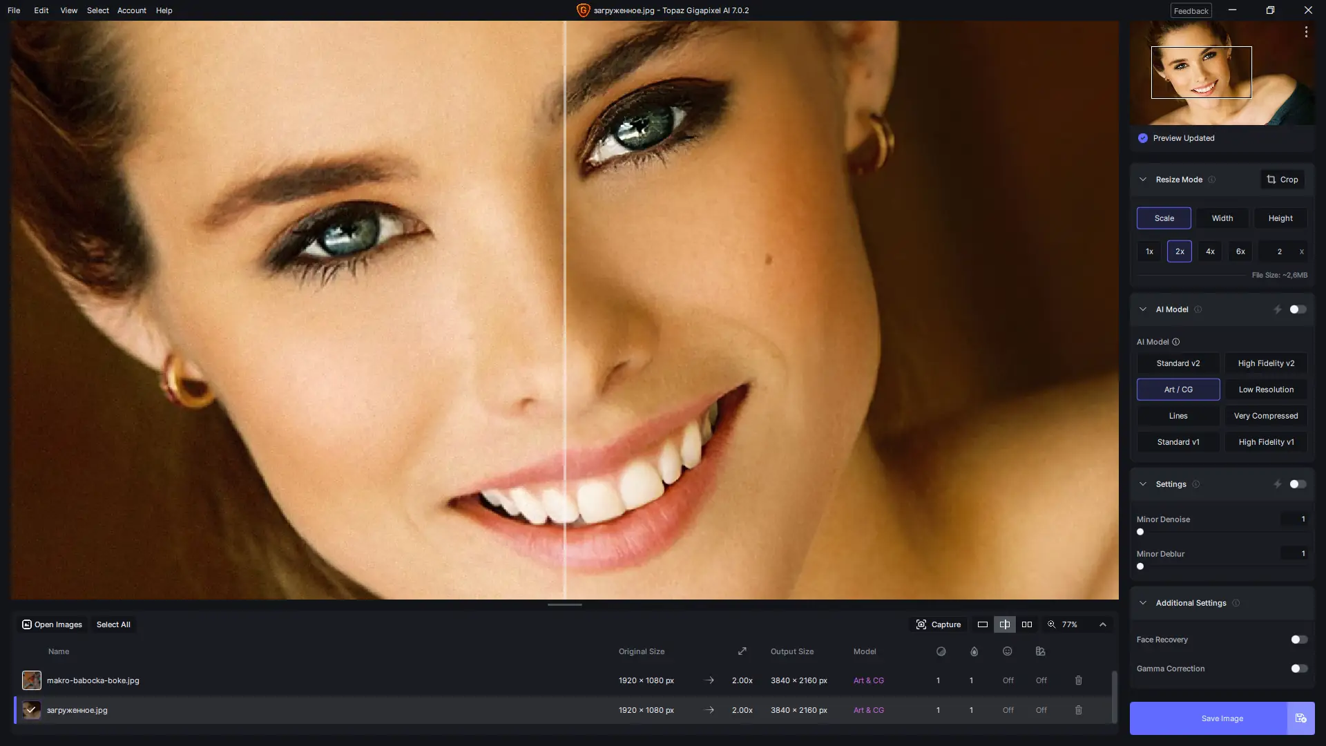 - Высокое качество масштабирования изображений с восстановлением деталей