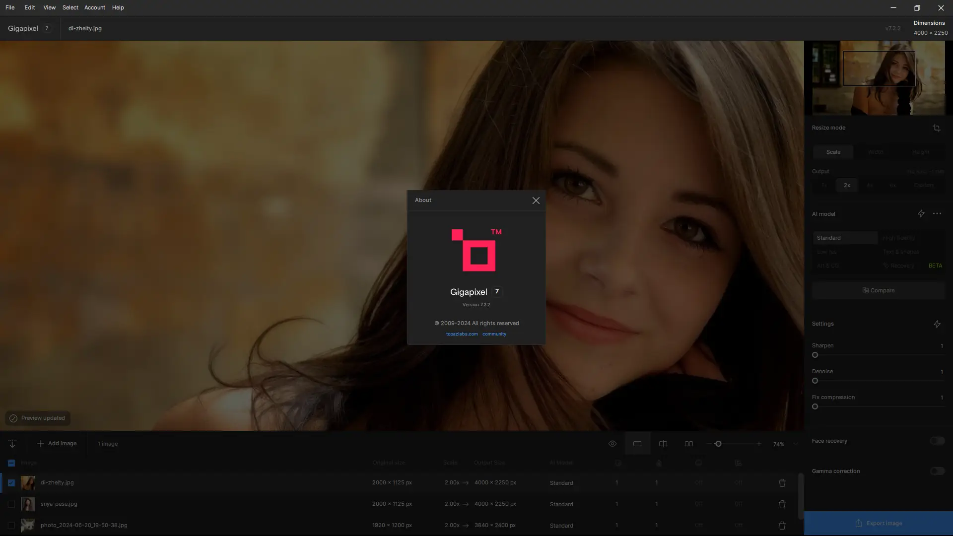 Topaz Gigapixel AI — это мощное приложение для увеличения изображений с помощью искусственного интеллекта. Оно позволяет достигать высококачественного масштабирования, сохраняя и восстанавливая важные детали, текстуры и четкость. Благодаря использованию технологий глубокой обработки изображений, программа отлично подходит для профессиональных фотографов, дизайнеров и любителей, желающих получить качественный результат без потери естественности.