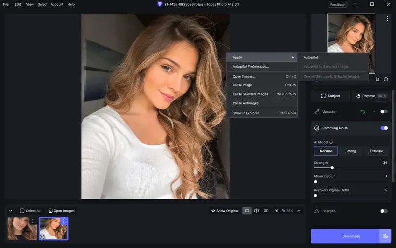 Для начала работы с программой необходимо загрузить изображения в интерфейс Topaz Photo AI. После этого можно выбрать автоматический режим, в котором функция Autopilot автоматически определит и исправит шум, размытость или недочеты фокуса. Также предусмотрен ручной режим, позволяющий точно настроить параметры обработки для достижения желаемого результата. В процессе редактирования программа использует алгоритмы искусственного интеллекта, что обеспечивает высокое качество выходных файлов и минимальные временные затраты.