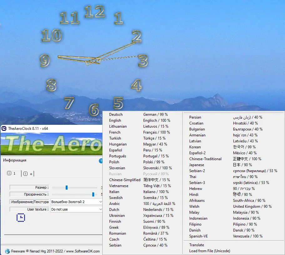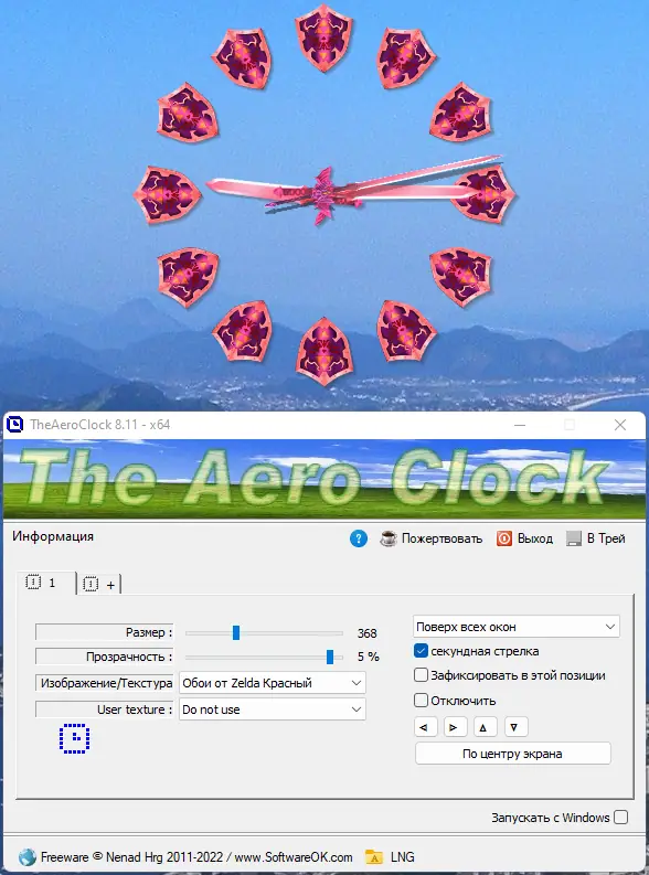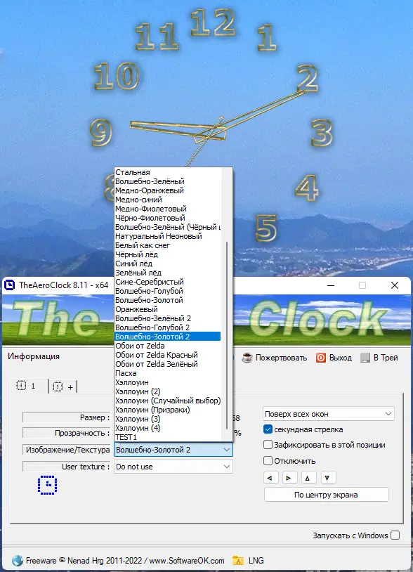 TheAeroClock представляет собой удобный виджет для отображения текущего времени на рабочем столе. Он отличается простотой настройки и высокой степенью кастомизации, позволяя изменять текстуру циферблата, фактуру, размеры и прозрачность. Благодаря возможности закрепления положения часов, пользователь может настроить их так, чтобы они всегда оставались в одном месте, не мешая работе. Программа подходит для тех, кто ищет альтернативные решения для отображения времени и хочет сделать интерфейс более индивидуальным.