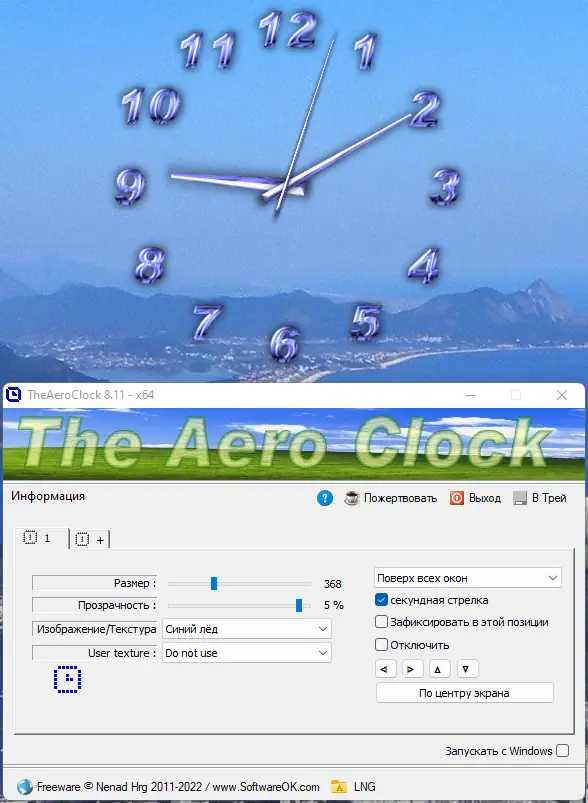 TheAeroClock — это портативное программное обеспечение для Windows, позволяющее установить на рабочий стол стильные и настраиваемые часы. Благодаря широким возможностям кастомизации, пользователи могут регулировать внешний вид, прозрачность, размер и положение отображаемых элементов, создавая удобный и эстетичный интерфейс. Программа запускается автоматически вместе с системой и отображается поверх всех окон, что делает её полезным инструментом для тех, кто ценит функциональность и дизайн рабочего пространства.