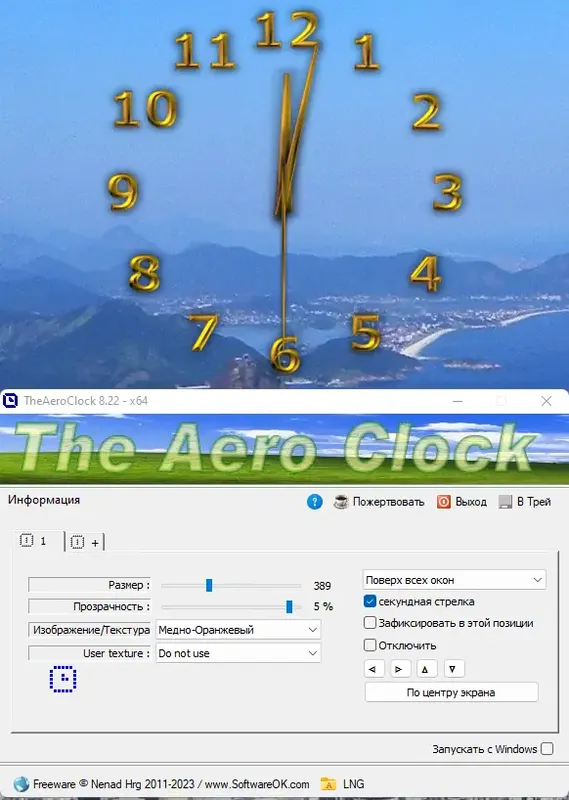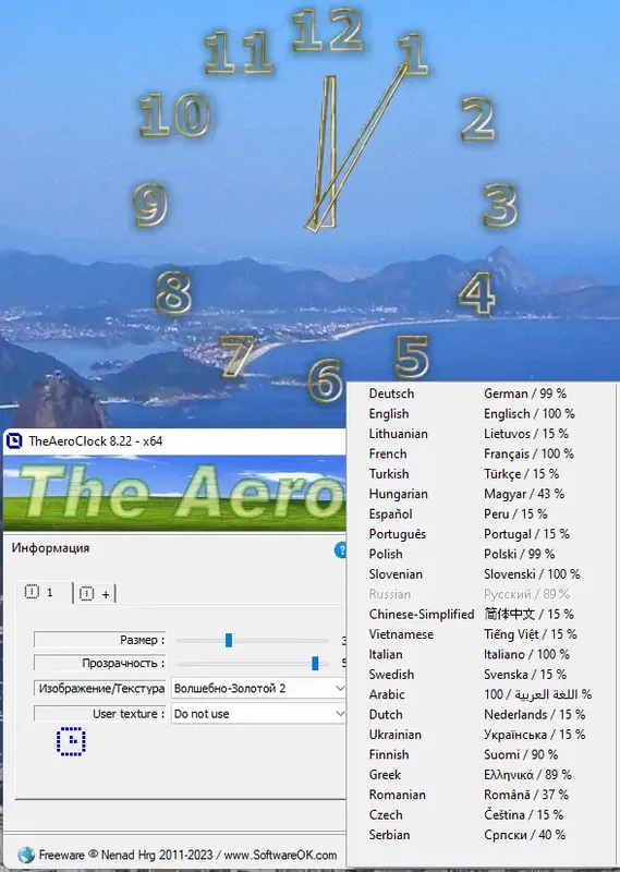TheAeroClock — это портативное приложение для Windows, которое позволяет установить на рабочий стол красивые и функциональные часы с множеством настроек. В программе можно регулировать прозрачность, внешний вид, размер, положение и текстуру циферблата, а также запускать их вместе с системой и отображать поверх других окон. Это удобное решение для тех, кто ценит стиль и функциональность рабочего интерфейса.