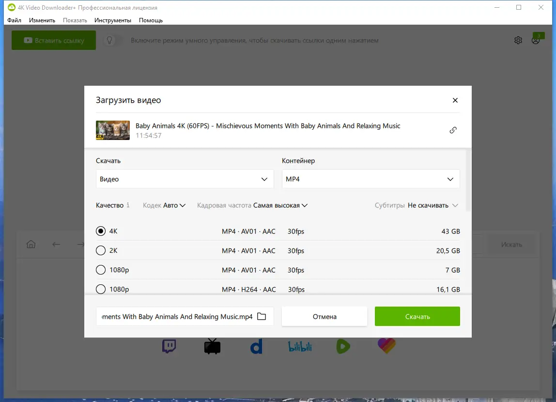 - Поддержка скачивания видео в 4K и 8K разрешениях