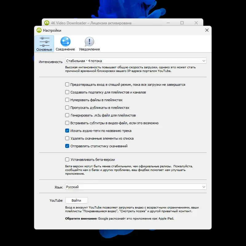 - Возможность скачивать целые плейлисты и каналы с YouTube.