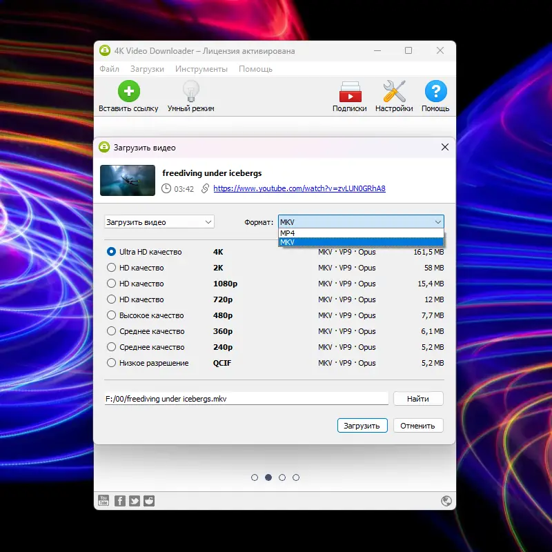 4K Video Downloader — это лицензированный и бесплатный youtube downloader, который позволяет скачивать видео с таких платформ, как YouTube, Facebook, Vimeo и других. Программа отличается удобным интерфейсом и высокой скоростью обработки запросов. Благодаря встроенной поддержке популярных форматов, вы можете сохранять файлы в MP4, MKV, MP3 и других форматах, что делает её универсальным решением для скачивания и хранения мультимедийных файлов.
