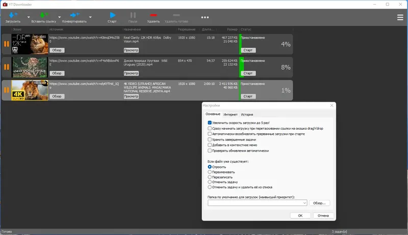 Для начала работы с программой необходимо скопировать ссылку на видео или плейлист с видеосервиса и вставить её в окно программы. После этого выбирается формат и качество файла, а также место сохранения. Можно активировать функцию автоматической загрузки новых видео с подписанных каналов, что удобно для постоянных подписчиков. Для расширенных настроек, таких как установка прокси или выбор разрядности, используется меню настроек или файл Settings.reg. Также программа позволяет скачать торрент-файлы и импортировать список ссылок для массового скачивания. После настройки достаточно нажать кнопку скачивания, и программа выполнит все операции автоматически.