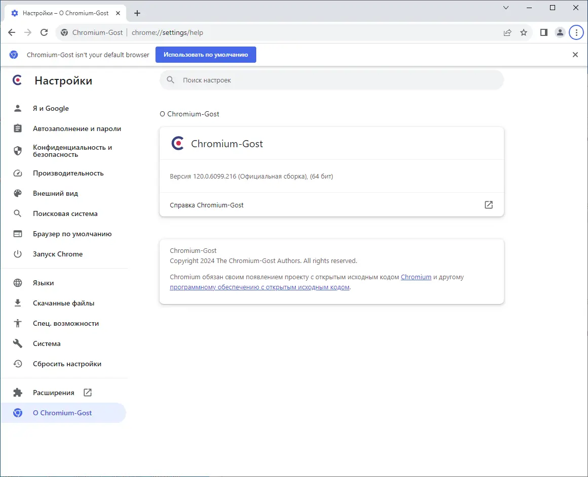 Chromium-Gost представляет собой модификацию стандартного браузера Chromium с открытым исходным кодом, дополненную поддержкой криптографических алгоритмов ГОСТ. В отличие от оригинальной версии, которая использует библиотеку BoringSSL для установления защищённых соединений, Chromium-Gost использует интерфейс msspi, обеспечивающий поддержку ГОСТ для российских пользователей. Это позволяет безопасно работать с сайтами, требующими российских стандартов шифрования, и обеспечивает соответствие требованиям национальной безопасности. Браузер сохраняет все основные функции Chromium, такие как расширения, вкладки, интерфейс и настройки, что делает его максимально удобным и привычным для пользователей.