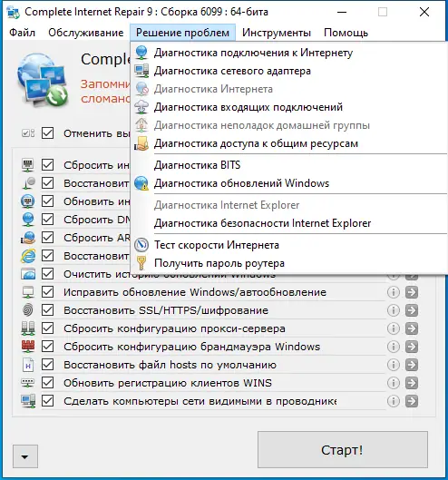 - Автоматическое восстановление интернет-протоколов и настроек сети.