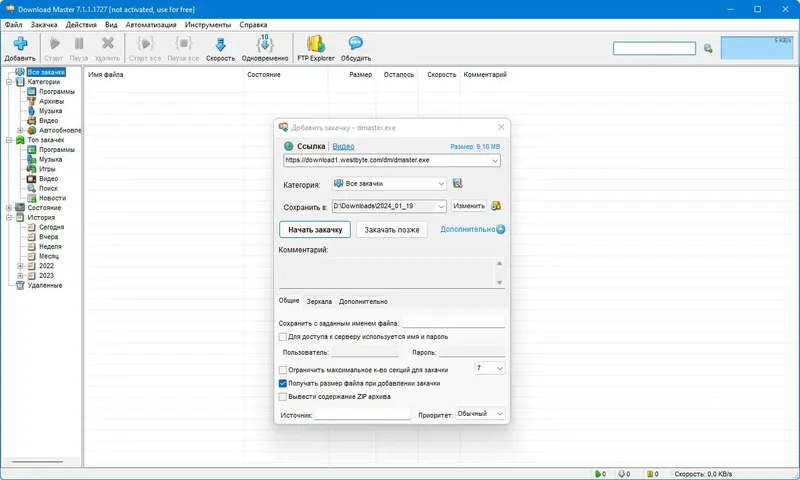 Для начала работы с Download Master достаточно установить программу, после чего она автоматически интегрируется с популярными браузерами. Для загрузки файла необходимо скопировать ссылку или перетащить её в интерфейс программы. Можно настроить параметры скорости, приоритеты и расписания закачек. В процессе скачивания пользователь может управлять активными закачками, ставить их на паузу или возобновлять. Программа также позволяет добавлять зеркала для ускорения загрузки и использовать функцию автоматического обновления для получения последних версий. Все операции удобно контролируются через интуитивно понятный интерфейс, что делает работу максимально комфортной и быстрой.