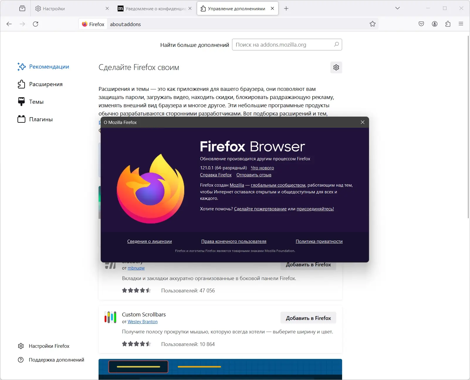 Firefox Browser — это полнофункциональный браузер нового поколения, разработанный компанией Mozilla. Он отличается высокой скоростью загрузки страниц, современным дизайном и надежной защитой данных. Программа обладает широкими возможностями по настройке внешнего вида и поведения, что делает серфинг в сети максимально комфортным и безопасным. Помимо этого, браузер поддерживает расширения, позволяющие расширить функционал и адаптировать его под индивидуальные нужды.