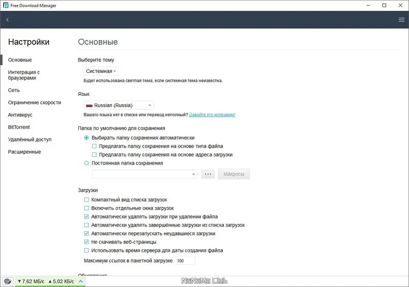 - Высокая скорость скачивания за счет многопоточности и разбиения файлов