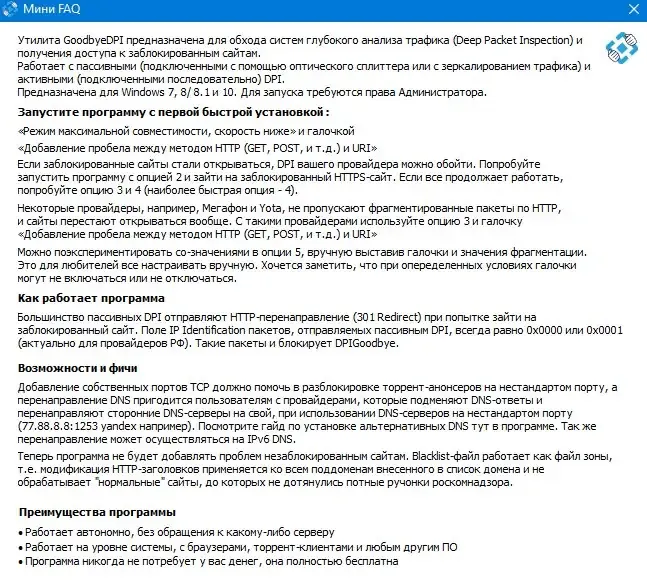 GoodbyeDPI — это программа для обхода систем глубокого анализа трафика (Deep Packet Inspection) и получения доступа к заблокированным сайтам. Она позволяет запускать утилиту GoodbyeDPI с удобным интерфейсом или в фоновом режиме в виде службы Windows, обеспечивая стабильный и быстрый обход блокировок без использования прокси или сторонних серверов. Инструмент работает локально на компьютере и не требует подключения к интернету, кроме обновления черных списков, что делает его безопасным и эффективным решением для пользователей, сталкивающихся с цензурой или ограничениями провайдеров.