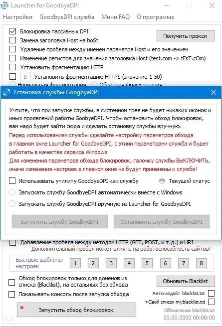 Для использования программы необходимо скачать и запустить Launcher for GoodbyeDPI с правами администратора. В интерфейсе можно выбрать быстрые настройки или произвести ручную конфигурацию, в зависимости от уровня знаний пользователя. После настройки программа автоматически запустит утилиту GoodbyeDPI, обеспечивая стабильный обход систем DPI и доступ к заблокированным сайтам. В случае необходимости можно включить режим службы Windows, чтобы программа работала в фоновом режиме без окон и иконок. Обновление черных списков происходит локально, что гарантирует безопасность и быстродействие.