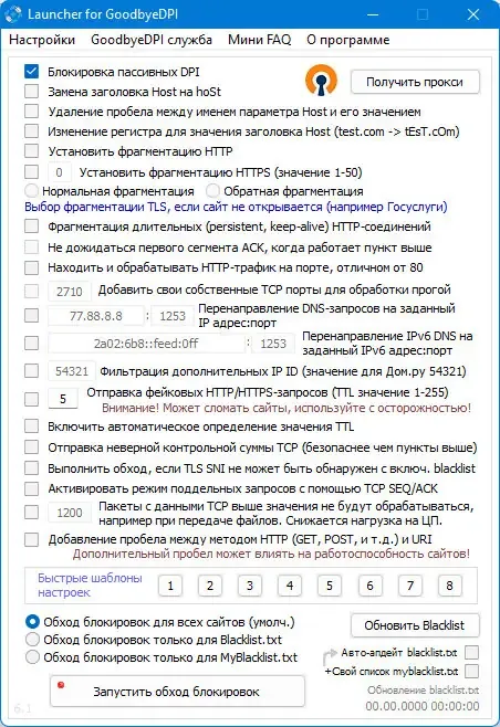 Для использования программы необходимо скачать и установить Launcher for GoodbyeDPI. После запуска от имени администратора пользователь может выбрать быстрые настройки или произвести ручную конфигурацию параметров. В интерфейсе доступны различные опции для обхода блокировок, настройки DNS и управления списками черных адресов. В случае возникновения проблем рекомендуется сначала использовать быстрые настройки, а при необходимости — вручную корректировать параметры. Встроенная инструкция и FAQ помогут понять работу программы и оптимизировать ее для конкретных условий.
