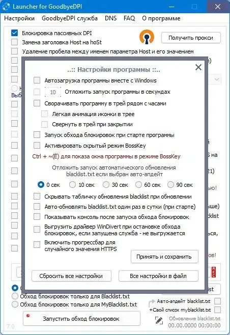 GoodbyeDPI — это мощный инструмент для обхода систем глубокого анализа трафика (Deep Packet Inspection) и получения доступа к заблокированным сайтам. В комплект входит удобный Launcher, который облегчает запуск утилиты с понятным интерфейсом. Программа работает автономно, не использует прокси и не снижает скорость соединения, что делает её универсальным решением для обхода блокировок в различных сетях.