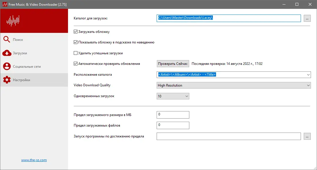 - Настраиваемый путь сохранения файлов и параметры загрузки
