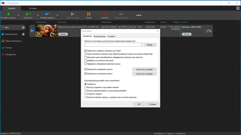 - Настраиваемый путь сохранения, ограничения на скорость и размер загрузок