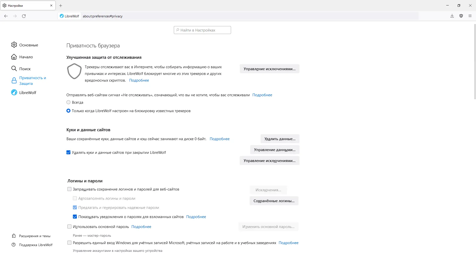 Браузер LibreWolf идеально подходит для тех, кто ищет максимально приватное решение для работы и серфинга в интернете.