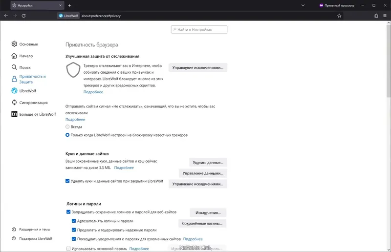 LibreWolf обеспечивает высокий уровень приватности и безопасности прямо из коробки, что делает его одним из лучших браузеров для защиты данных пользователя.