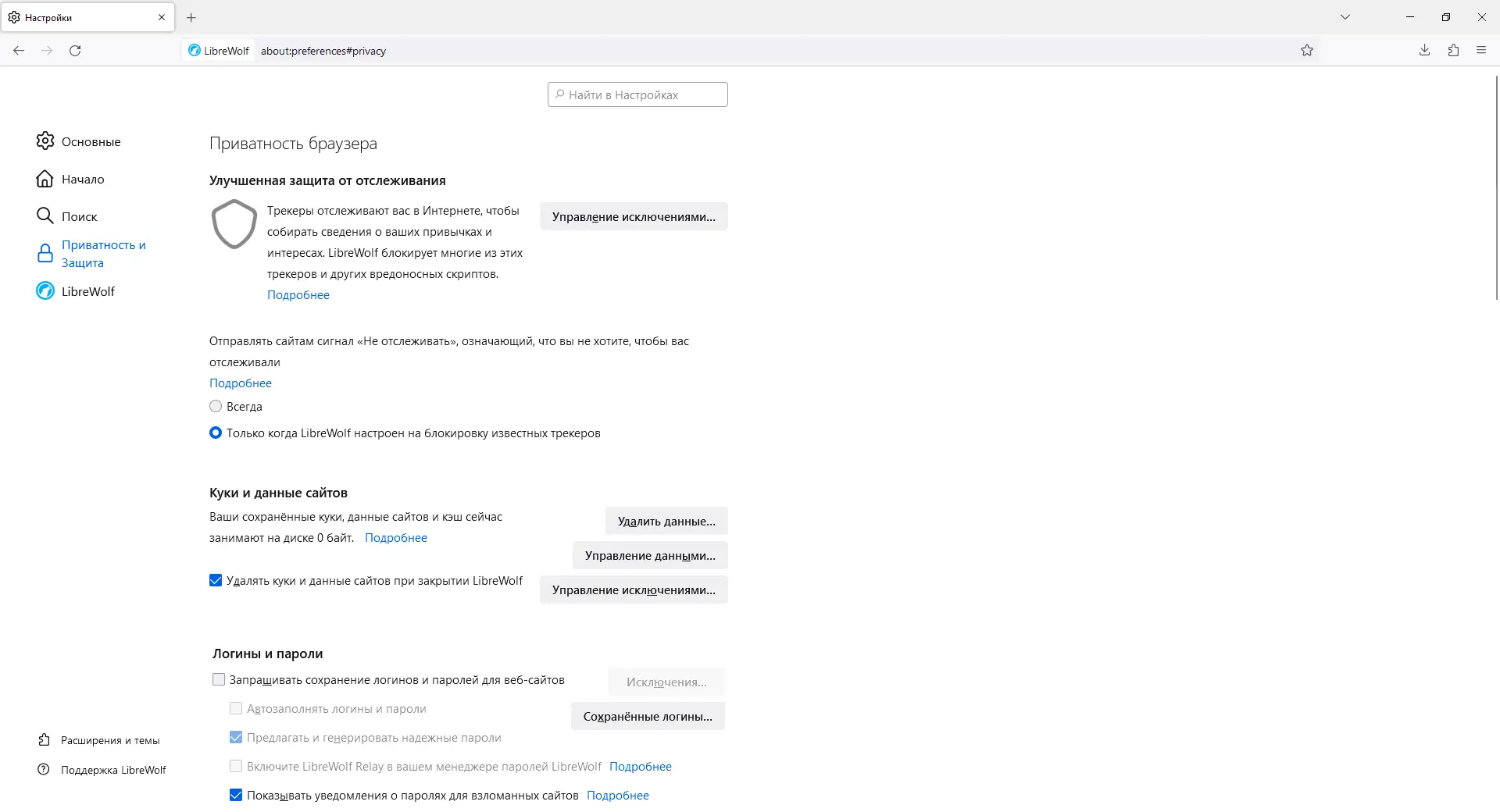 LibreWolf обеспечивает конфиденциальность и безопасность без необходимости сложных настроек.