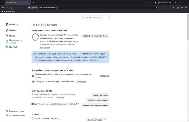 LibreWolf — это модифицированный браузер, созданный для обеспечения максимальной приватности пользователей. Он избавлен от телеметрии, рекламы и спонсируемого контента, что делает его идеальным инструментом для тех, кто заботится о своей конфиденциальности в сети. В основе его работы лежит движок Firefox, однако в нем исключены все элементы, которые могут сказываться на анонимности и безопасности. Благодаря использованию приватных поисковых систем и встроенному блокировщику рекламы, LibreWolf помогает снизить риск отслеживания и сохранения личных данных.