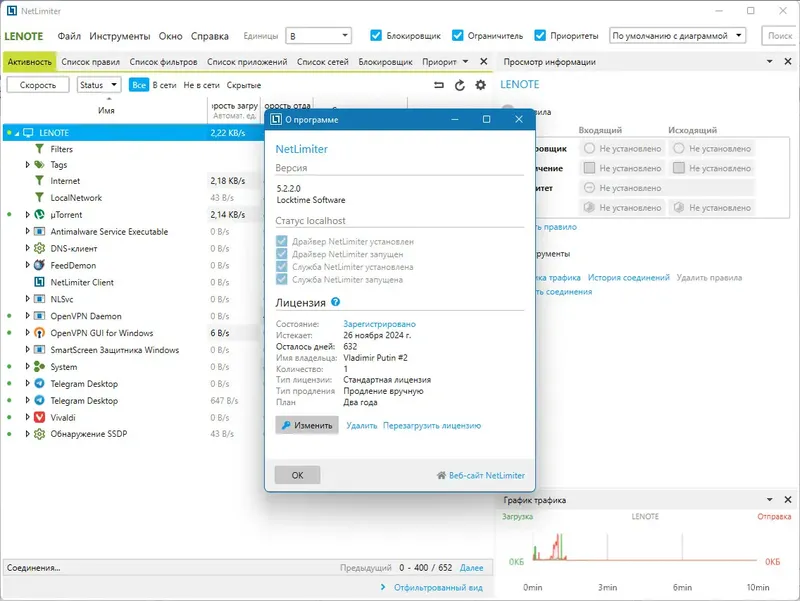 NetLimiter — это универсальный инструмент для мониторинга и ограничения интернет-трафика, который подойдет как для домашних пользователей, так и для специалистов. Он позволяет вести подробную статистику по каждому соединению, отображая данные в виде графиков и таблиц, что делает анализ трафика максимально наглядным. Программа предоставляет возможность настроить ограничения скорости для отдельных приложений или соединений, что помогает избежать перегрузки сети и повысить стабильность работы системы.