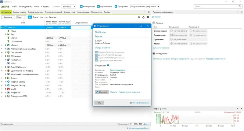 NetLimiter — это универсальный инструмент для мониторинга и ограничения интернет-трафика, который помогает пользователям управлять пропускной способностью каждого приложения. Он позволяет установить лимиты скорости загрузки и выгрузки, а также блокировать доступ к сети для отдельных программ. Программа ведет подробную статистику использования трафика, отображая данные в виде графиков и таблиц, что облегчает анализ сетевой активности. Благодаря наличию фильтров по протоколам, IP-адресам и направлениям, пользователи могут точно настроить параметры работы интернета под свои нужды. Это делает NetLimiter незаменимым помощником для тех, кто ценит стабильность и безопасность соединения, а также желает повысить эффективность работы сети.