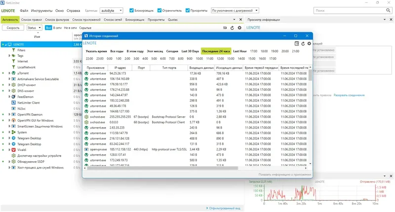 - Мониторинг трафика приложений и подключений в реальном времени.