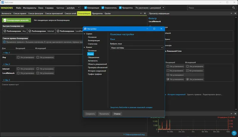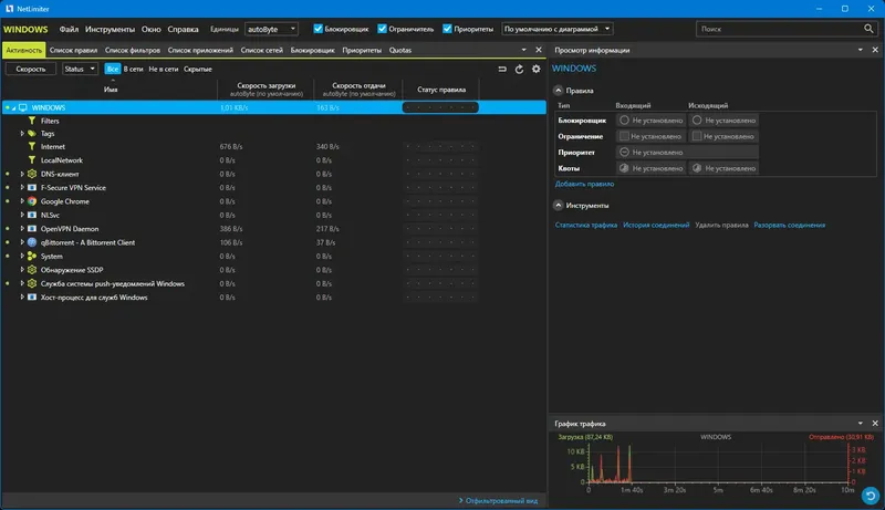 NetLimiter представляет собой универсальное решение для мониторинга интернет-трафика, позволяющее точно отслеживать деятельность приложений и управлять их сетевым доступом. Программа обеспечивает отображение подробной статистики в виде графиков и таблиц, что помогает анализировать использование интернета в реальном времени. Благодаря гибким настройкам, пользователи могут ограничить скорость загрузки или выгрузки данных, установить лимиты для отдельных программ и настроить приоритеты, что особенно важно в условиях ограниченных сетевых ресурсов.