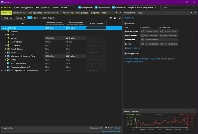 NetLimiter — это универсальный инструмент для контроля интернет-трафика, который предоставляет пользователю полный контроль над всеми исходящими и входящими соединениями. С помощью программы можно легко определить, какие приложения и процессы используют сеть, и настроить их работу по своему усмотрению. Помимо этого, NetLimiter позволяет ограничивать скорость передачи данных для отдельных программ или соединений, что помогает оптимизировать работу сети и повысить безопасность. Такой подход особенно актуален для пользователей, которым необходимо обеспечить приоритет определённых задач или ограничить доступ к интернету для нежелательных программ.