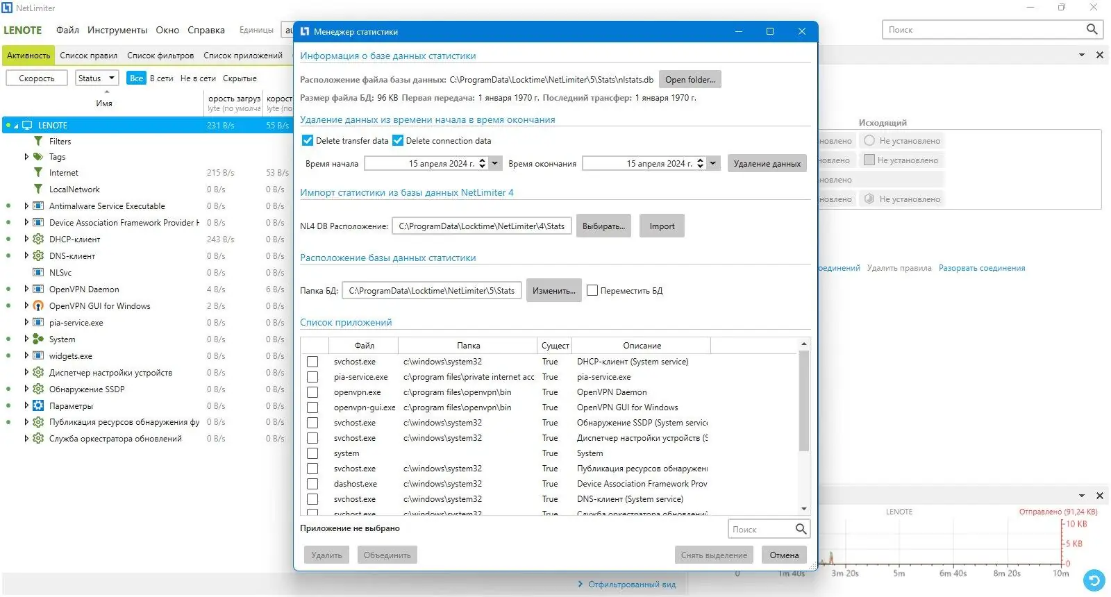 Для начала работы с программой необходимо установить NetLimiter, после чего она автоматически начнет отслеживать сетевую активность. В интерфейсе можно выбрать отдельные приложения и задать им лимиты скорости или полностью заблокировать доступ. Также можно настроить приоритеты трафика, чтобы важные программы работали без перебоев. В разделе статистики отображаются графики и таблицы, позволяющие анализировать использование интернета за выбранный период. Для более гибкого управления доступны планировщики задач и фильтры по различным параметрам, что делает работу с программой максимально удобной.