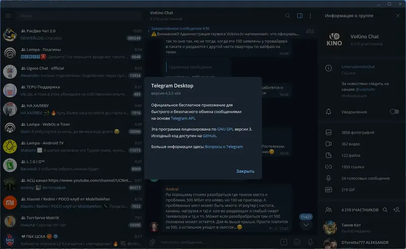 Telegram Desktop — это универсальный мессенджер, доступный для скачивания и установки на компьютеры с операционной системой Windows. Он отличается простым интерфейсом, высокой скоростью работы и надежной системой шифрования данных. Используя Telegram Desktop, пользователи могут отправлять текстовые сообщения, фотографии, видео, документы и файлы любого типа, а также создавать группы до 200 человек или координировать крупные сообщества до 5000 участников. Программа поддерживает синхронизацию чатов на всех устройствах, что делает её удобным инструментом для личного и делового общения в любой ситуации.