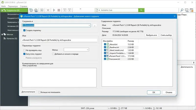 µTorrent Pack (Repack & Portable) — это популярный клиент для скачивания и раздачи файлов по протоколу BitTorrent. Благодаря минимальному размеру и богатому функционалу, программа считается одним из лучших решений для загрузки через пиринговые сети. Она подходит для пользователей, желающих быстро и удобно скачивать файлы с интернета на Windows 10 и других версиях системы, обеспечивая стабильную работу и расширенные возможности управления торрентами.