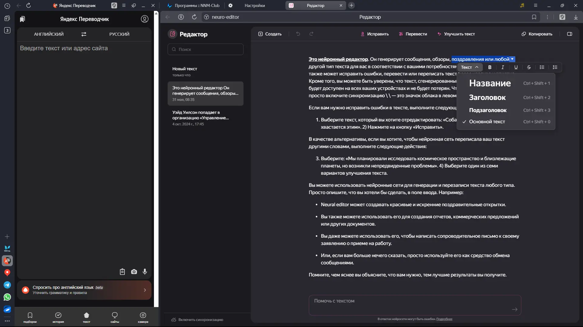 - Интеграция с нейросетями для перевода, озвучивания видео и генерации текста.