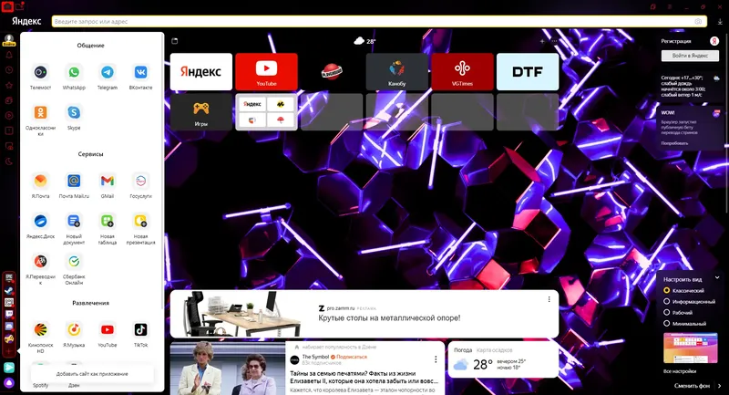 Яндекс.Браузер — это современный и быстрый интернет-обозреватель, созданный компанией Яндекс на базе Chromium. Он обеспечивает комфортное серфинг в сети благодаря множеству полезных функций, таких как ускоренная загрузка страниц при слабом соединении, быстрый доступ к часто посещаемым сайтам и встроенные инструменты защиты. Браузер легко адаптируется под нужды пользователя и включает ряд уникальных решений для повышения безопасности и удобства работы в интернете.