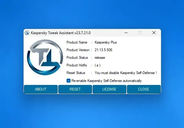 Kaspersky Tweak Assistant — это небольшая программа, предназначенная для сброса триального периода продуктов компании «Касперский». Она позволяет пользователям вновь активировать пробную версию антивирусных решений, таких как Kaspersky Anti-Virus, Internet Security и Total Security, без необходимости переустановки или приобретения новой лицензии. Инструмент прост в использовании и не требует специальных навыков, что делает его популярным среди тех, кто хочет продлить использование антивируса бесплатно и без лишних затрат.