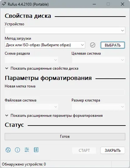 Rufus — это бесплатная портативная программа, предназначенная для форматирования и создания загрузочных USB-накопителей. Ее основные преимущества — высокая скорость выполнения задач и минимальные системные требования. Несмотря на небольшой размер, Rufus обеспечивает все необходимые функции для работы с ISO-образами, включая создание загрузочных установочных носителей для операционных систем Windows и Linux, а также подготовку микропрограмм из DOS. Это делает программу незаменимой при необходимости быстро подготовить флешку для установки или восстановления системы.