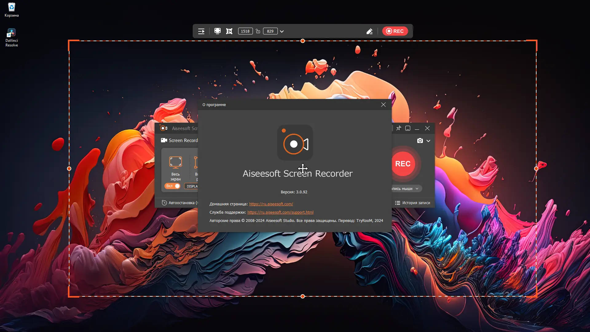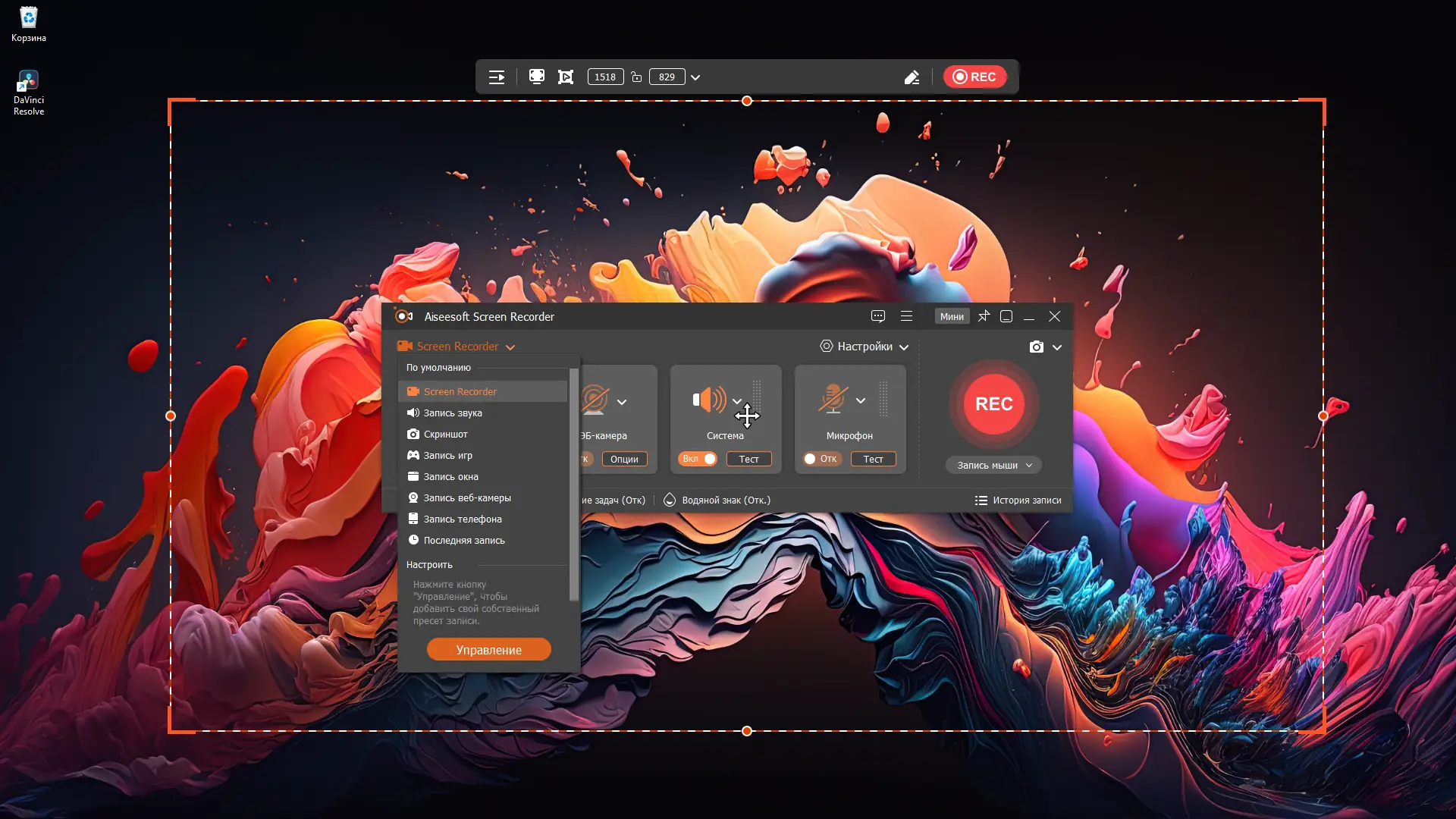 - Запись видео с экрана в HD качестве и с возможностью выбора области захвата