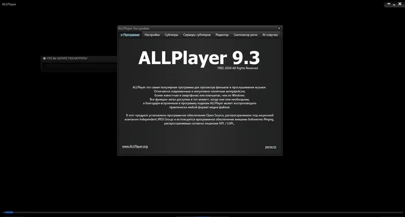 ALLPlayer — это универсальный мультимедиа проигрыватель, который обеспечивает комфортное воспроизведение видео и аудио файлов на компьютерах с Windows. Благодаря встроенным кодекам и современному движку программа поддерживает почти все популярные форматы мультимедиа, что делает её надежным решением для просмотра фильмов, прослушивания музыки и работы с субтитрами. Простота интерфейса и широкий функционал позволяют легко управлять воспроизведением, а встроенная база данных субтитров гарантирует синхронность и качество отображения текста.