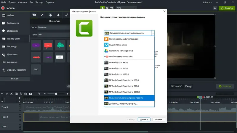 - Большой набор встроенных эффектов и инструментов редактирования.