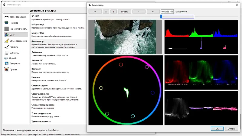 - Наличие богатого набора фильтров для улучшения изображения и звука, таких как резкость, шумоподавление, ресайзинг и деинтерлейсинг.