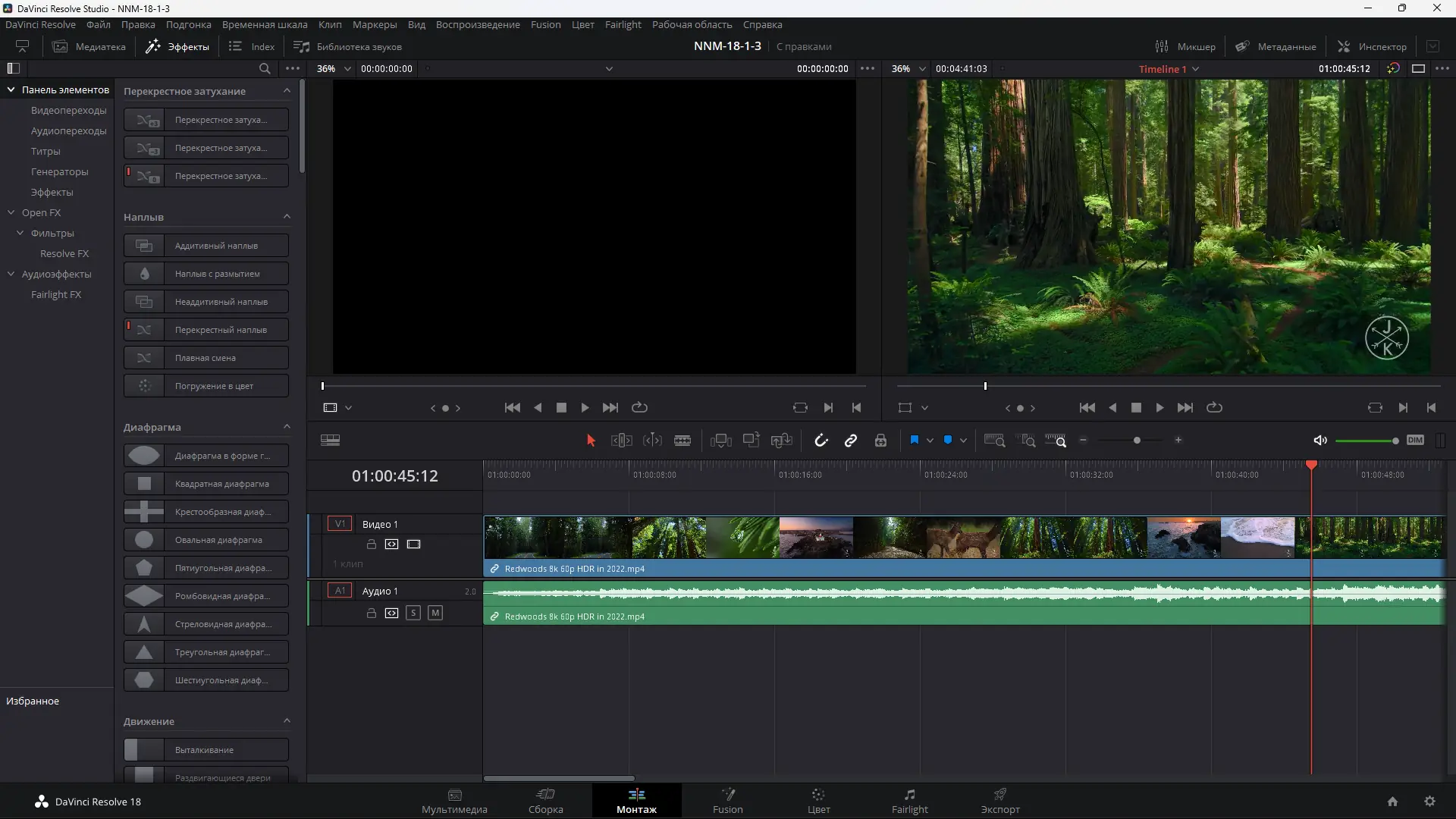 - Широкий спектр инструментов для монтажа, цветокоррекции и VFX.