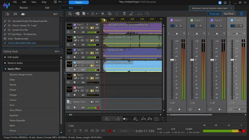 Для начала работы с программой необходимо импортировать необходимые аудиофайлы или видео в поддерживаемых форматах. После этого можно использовать инструменты автоматической очистки, такие как AI Wind Remove или Noise Reduction, чтобы улучшить качество звука. В процессе редактирования доступны многодорожечные записи, а также визуальные инструменты для точной настройки направления и высоты звука в 360 видео. Для профессиональных задач предусмотрены функции микширования, применения эффектов и автоматической подгонки фоновой музыки под длину видео. После завершения редактирования можно экспортировать финальный результат в наиболее подходящем формате, сохранив качество и совместимость с другими платформами.