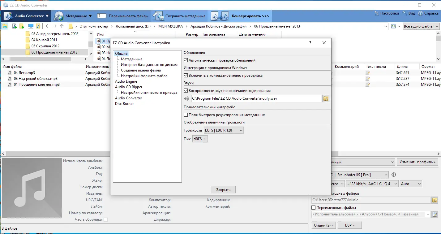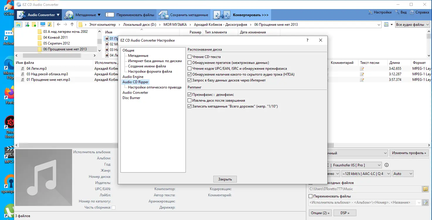 EZ CD Audio Converter — это продвинутый конвертер аудио, который позволяет легко преобразовывать файлы между различными форматами, такими как MP3, WAV, FLAC, AAC, OGG и многими другими. Помимо этого, программа поддерживает запись аудио на CD, работу с защищенными дисками и чтение поврежденных носителей. Среди ключевых преимуществ — использование как стандартных драйверов Windows, так и внешних кодеков, что обеспечивает максимальную совместимость и качество обработки звука. Встроенная база freedb позволяет автоматически получать сведения о дисках, а поддержка тегов ID3 и ID3V2 помогает сохранять информацию о композициях. Также программа включает функции нормализации уровня громкости, удаления пауз и создания списков воспроизведения, что делает ее незаменимым инструментом для обработки аудио файлов.