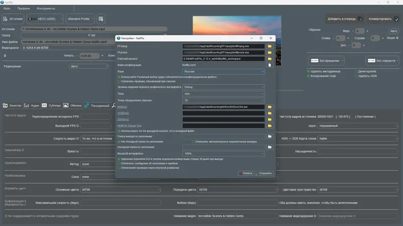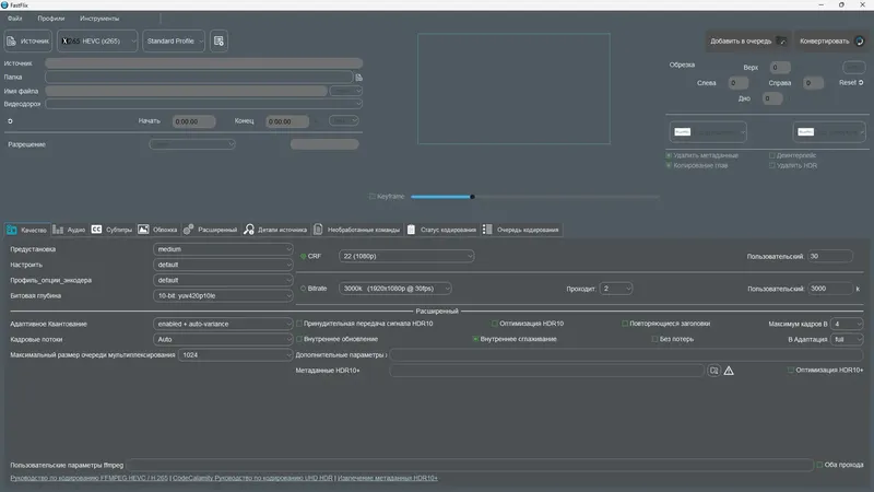 FastFlix представляет собой мощный инструмент для кодирования видео, объединяющий простоту использования с широкими возможностями настройки. Благодаря графическому интерфейсу, пользователи могут управлять всеми параметрами конвертации, включая битрейт, глубину цвета, профиль, а также редактировать аудио и субтитры. Поддержка метаданных HDR10 для популярных кодеков, таких как x265, NVEncC HEVC и VCEEncC HEVC, обеспечивает сохранение высокого качества изображения при сжатии. В будущем программа планирует расширить поддержку до формата AV1, что сделает ее еще более универсальной. Для работы необходим набор библиотек FFmpeg, которые легко установить автоматически при первом запуске. Интерфейс программы позволяет легко переключать языки, настраивать параметры кодирования и следить за процессом в режиме реального времени.