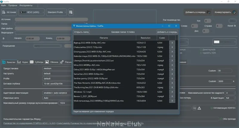 - Поддержка кодеков x265, NVEncC HEVC и VCEEncC HEVC