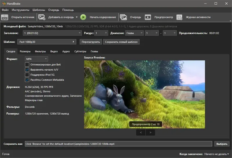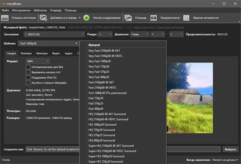 Работа с HandBrake очень проста благодаря интуитивно понятному интерфейсу и наличию готовых пресетов. Для начала необходимо выбрать исходный файл или диск, после чего программа автоматически определит его параметры. Далее выбирается один из пресетов, соответствующий нужной платформе или устройству, или настраиваются параметры вручную. После этого остается только выбрать место для сохранения результата и нажать кнопку запуска конвертации. В процессе можно отслеживать прогресс и при необходимости вносить изменения в настройки. Программа также поддерживает перевод интерфейса на русском языке, что делает её удобной для русскоязычных пользователей.