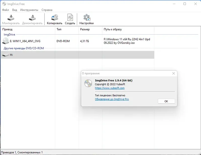 ImgDrive — это удобный и надежный эмулятор дисков, который позволяет монтировать файлы образов различных форматов без необходимости использования физических приводов. Он отлично подходит для работы с ISO, CUE, NRG, MDS/MDF, CCD и ISZ файлами, а также для воспроизведения аудиодисков из файлов FLAC, WAV и других форматов. Простота в использовании и интеграция в систему делают его незаменимым инструментом для любителей мультимедиа и профессиональных пользователей.
