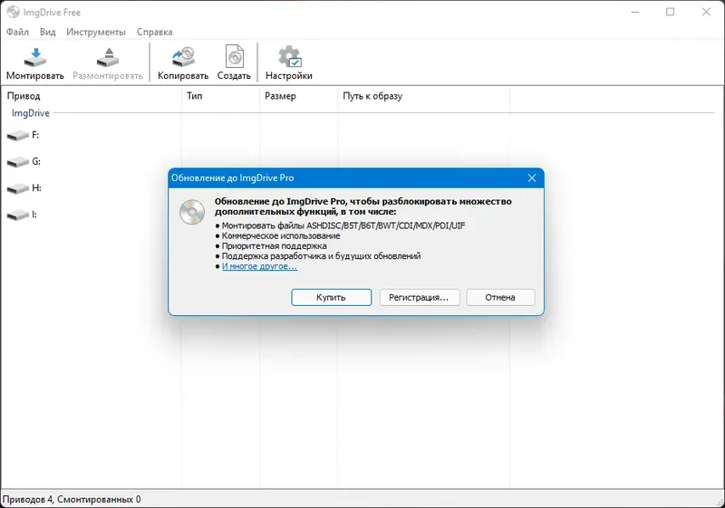 ImgDrive — это современный эмулятор, который обеспечивает легкое монтирование образов ISO, CUE, NRG, MDS/MDF, CCD, ISZ и других форматов с помощью всего одного клика. Он интегрируется в системное меню Windows и работает из системного трея, что позволяет максимально упростить работу с виртуальными дисками. Благодаря поддержке мульти-сессионных образов и четырем виртуальным приводам одновременно, программа подходит для профессионального использования, например, для работы с мультимедийным контентом или архивами. Возможность монтировать музыкальные файлы как AUDIO CD расширяет функционал программы и делает ее универсальным решением для различных задач в области мультимедиа и эмуляции дисков.