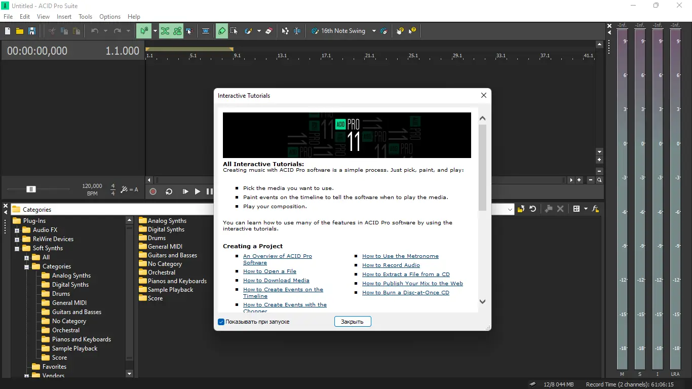 Для начала работы с программой необходимо установить ACID Pro 11, следуя инструкциям по инсталляции. После запуска можно импортировать аудиофайлы различных форматов, таких как WAV, MP3, AIFF или OGG, и приступить к редактированию. Встроенные инструменты Beatmapper и Chopper позволяют легко создавать ремиксы и семплы, а автоматизированные эффекты помогают быстро добиться желаемого звучания. Рабочая панель и таймлайн предоставляют удобный интерфейс для организации дорожек, настройки темпа и применения эффектов в реальном времени. Весь процесс можно сопровождать записью MIDI и автоматизацией параметров, что значительно расширяет творческие возможности.